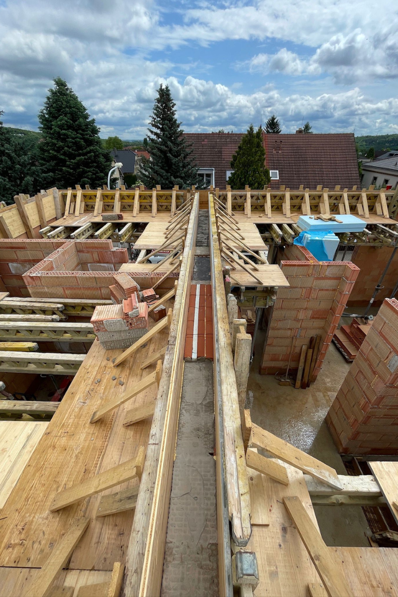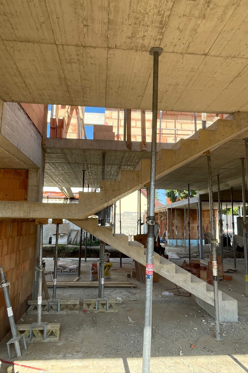 Realizaci novostavby předchází demolice původního objektu. Nový objekt je situován na mírně svažitém pozemku s bohatou vzrostlou zelení.Hlavní hmota domu je tvořena jednoduchým kubickým objemem, který doplňuje tvarově dynamické střešní konstrukce. Kontrast materiálů – bílá omítka horní části a tmavší platforma obložená plechem – dodává stavbě eleganci a vizuální výraznost. Velkoformátová okna zajišťují přísun denního světla a posilují propojení obytných prostorů se zahradou. Díky těmto prvkům vzniká moderní a komfortní domov, který přirozeně zapadá do okolí.